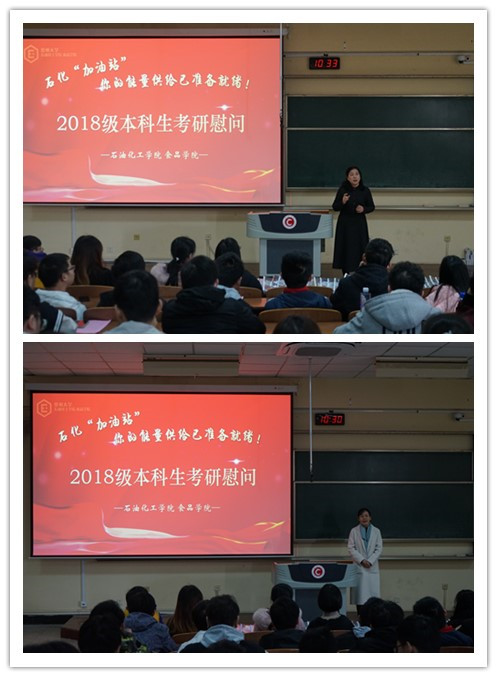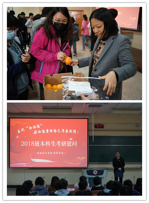 管春英结合自身求学经历激励考生们在最后冲刺阶段静心聚力,以必胜的信念迎接挑战;钟璟悉心询问了各位考研学子的复习进度和心理状态,并给予针对性的意见;宣慧勉励大家“一‘研’为定,明年一定研一”,踏上更高的平台,迎接新的挑战;刘文杰对考研学子的执着追梦精神表示肯定,并指出考研是提高学业水平的重要途径,对未来发展起重要作用。最后,学院还为考研学子们发放石化“加油卡”、石化“加油包”、石化“加油橙”,祝愿所有考研学子心想事成,马到成功!