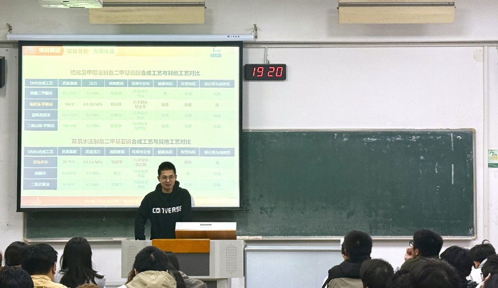 为帮助同学们拓宽专业视野、提升专业实践能力,11月11日晚,“石化青年说”系列讲座第二讲在W1207教室顺利举行,讲座由化工224班常佩源与化工226班张皓博两位同学担任主讲。他们所在的常州大学“砜硫队”,曾凭借“福建凯美特气体有限公司分公司年产1.5万吨二甲基亚砜项目”的出色设计,在2025年“天正设计杯”第十九届全国大学生化工设计竞赛中脱颖而出,斩获全国特等奖。