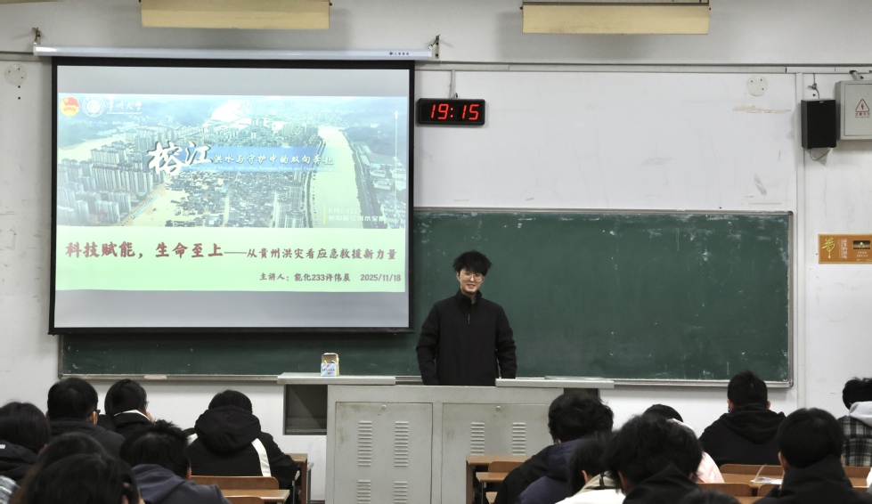 为帮助同学们更直观地了解科技如何重塑应急救援体系、守护生命安全,11月18日晚,学生第二党支部党员能化233班许伟晨在W1205教室开展了“青年讲师团”系列讲座的第三讲——“贵州洪灾,见证科技力量”。
