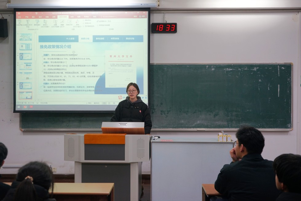 会上,两位同学结合个人经历,围绕推免政策解读、前期准备、院校选择、面试技巧等关键环节展开细致分享。化工225班王舒以“厚积薄发”为主题,指出扎实的专业课是推免基石,并分享了学习方法与科研竞赛对提升能力的关键作用。能化222班崔蕾则聚焦“精准发力”,详解推免流程与材料准备要点,建议及早关注目标院校动态,并结合实例分享了面试中展现优势、从容应答的技巧。